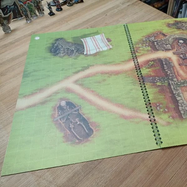 Un bac à sable ! Le plan est quadrillé en hexagone et quelques lieux d’importance (les villages, les ponts…) sont indiqués. Laissez vos joueurs visiter les lieux et décider des endroits où ils souhaitent se rendre… Suivant les choix qu’ils feront, dévoilez le plan adéquat.