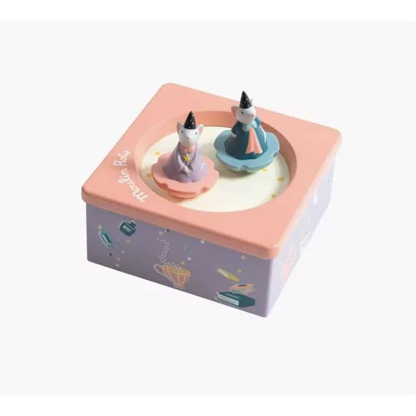 Boîte à musique avec illustrations féériques: grimoires, fioles de poudre dorée, tasses et théière magiques, tous les accessoires pour que les 2 petites souris, en résines, apprenties magiciennes puissent, dans une douce farandole, bercer et endormir bébé.
