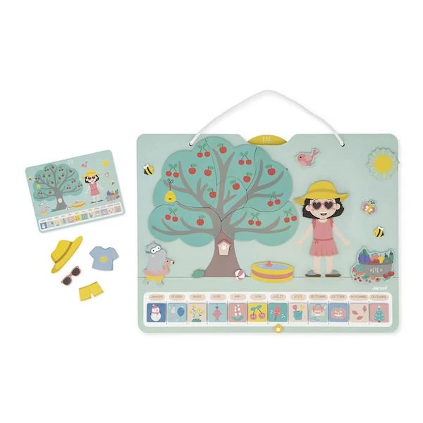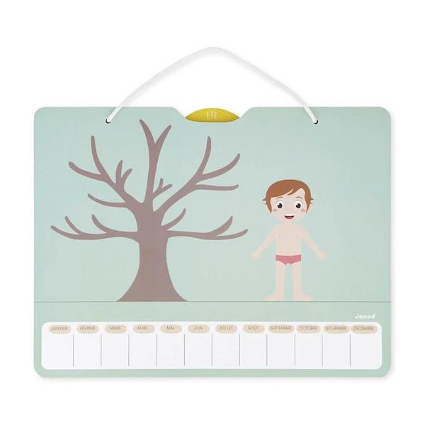 En plus, 12 aimants « mois » joliment illustrés permettent également d’assimiler la chronologie d’une année et de s’y repérer grâce à un aimant curseur. Sur le dessus du tableau, on retrouve une roue qui permet d’indiquer la saison.