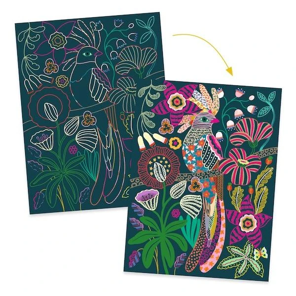 Une pochette de 4 cartes à gratter avec couleur fluo dans une ambiance chatoyante. L’enfant reproduit les motifs imaginés par l’artiste en grattant la surface à l’aide du stylet en bois. Progressivement, les illustrations sont révélées comme par magie !