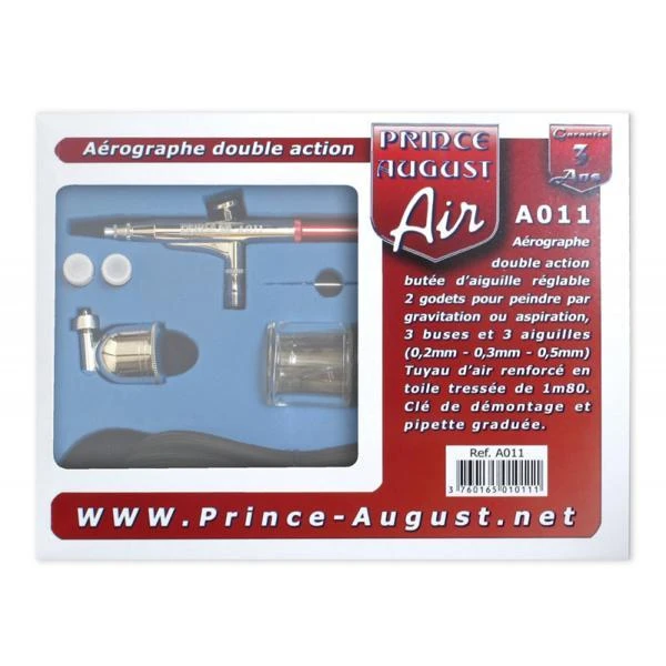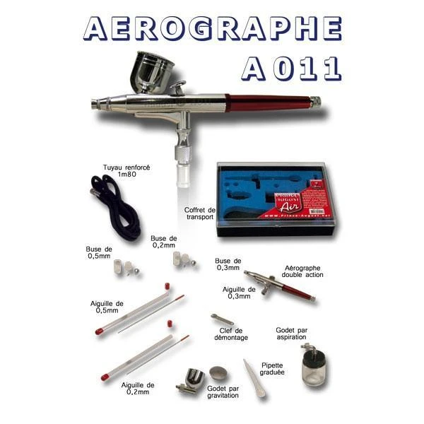 Cet Aérographe double action, vous permettra de régler le débit de peinture en ajustant la butée d’aiguille et le débit d’air en actionnant la gâchette. 2 godets sont à votre disposition : le godet par gravitation pour peindre au plus près de vos pièces et le godet par aspiration pour disposer d’une quantité plus importante de peinture lorsque la surface à peindre est plus grande. La pipette graduée vous permettra de prélever avec précision la quantité de peinture, de diluant ou d’eau que vous souhaitez utiliser. Ce Coffret vous permet de choisir la formule qui convient le mieux à votre prise en main et au travail à réaliser. 3 buses et 3 aiguilles (0, 2mm – 0, 3mm – 0, 5mm) interchangeables avec la clef de démontage, vous permettront d’ajuster la précision de vos pulvérisations et de vos tracés. Le tuyau d’air renforcé en toile tressée de 1m80 offre une grande amplitude pour toutes vos applications.