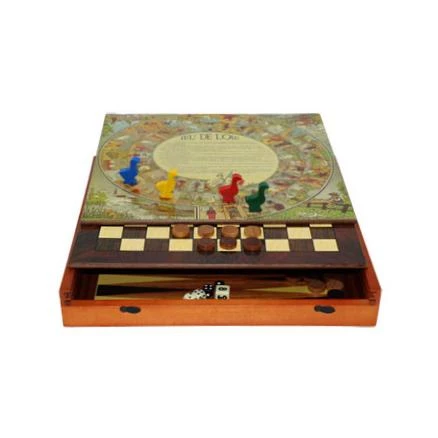 Coffret luxe en bois contenant 5 jeux : Oie / Petits chevaux / Echecs / Dames françaises / Backgammon