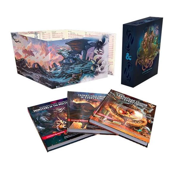 Réunis pour la première fois dans un superbe coffret, retrouvez deux des suppléments de règles les plus vendues de la cinquième édition : Xanathar’s Guide to Everything, Tasha’s Cauldron of Everything ainsi que le nouveau Monsters of the Multiverse, et un écran du maître du donjon à l’illustration inédite.