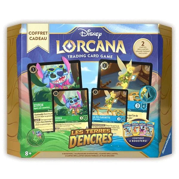 Le coffret cadeau comprend 2 cartes à collectionner surdimensionnées et 2 cartes de jeu jouables en plus des jetons de jeu et 4 boosters aléatoires. Le coffret cadeau Disney Lorcana TCG pour le set Les Terres d’Encres comprend Stitch – Agent sous couverture et La Fée Clochette – Fée très maline.