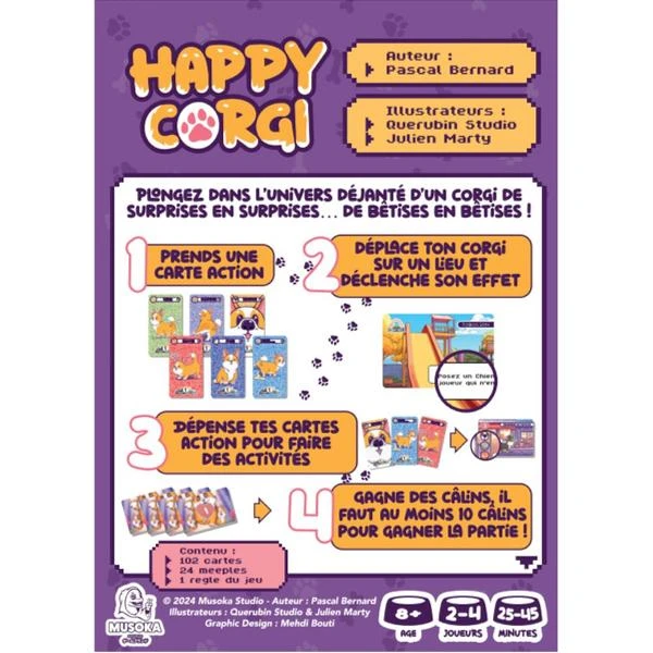 Dans Happy Corgi, vous devrez accomplir une tonne d’activités pour remplir votre jauge de bonheur. Déplacez-vous de lieu en lieu afin d’appliquer des effets, puis placez vos crottes, reniflez des popotins ou encore partez à l’aventure dans le parc et l’appartement !