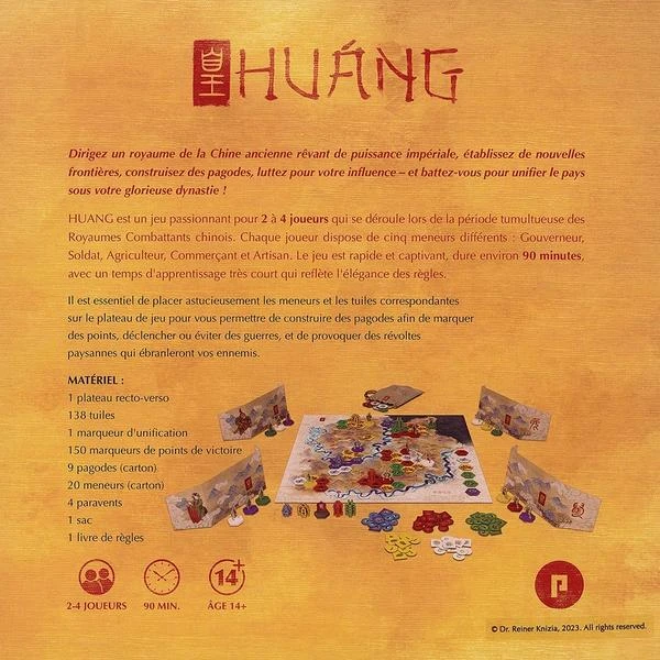 Le placement intelligent de ces dirigeants et de leurs tuiles correspondantes sur le plateau est essentiel, vous permettant de construire des pagodes pour marquer des points, déclencher ou éviter des guerres et déclencher des révoltes paysannes qui feront tomber vos ennemis. Le jeu est rapide et addictif, facile à prendre en main reflétant l’élégance des règles du jeu.