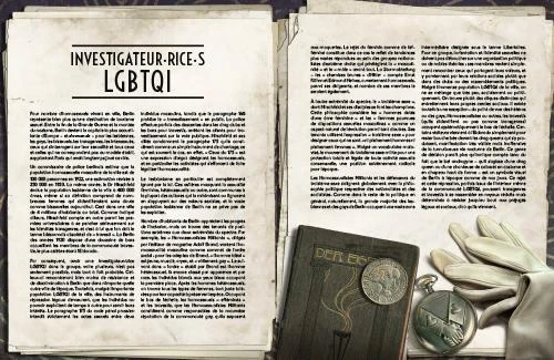 À ce bouillonnement, Berlin la Dépravée ajoute les éléments surnaturels du Mythe de Cthulhu. La ville est un foyer d’organisations occultes, de sectes singulières et de légendes chuchotées au détour d’une rue. Dans l’air malsain de la capitale mondiale de la débauche, la nature humaine est remise en question. Et tandis que Berlin se précipite inexorablement vers un destin funeste, l’atmosphère oppressante s’alourdit encore, mettant à rude épreuve la raison des investigateurs.