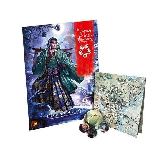 L’Étreinte de l’hiver contient une aventure de 32 pages ; un plan recto verso plié représentant les terres des Clans de la Grue et de la Mante, ainsi que l’élégant Kyūden Doji, les Vénérables Palais de la Grue ; ainsi que plus de 50 jetons représentant les personnages de ce scénario.