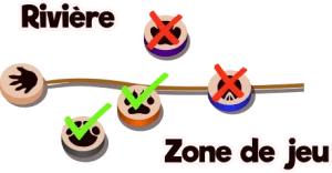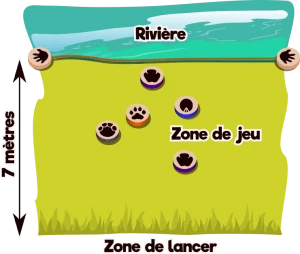 En cas d’égalité, les joueurs sont départagés par un dernier lancer, effectué en même temps. L’animal le plus proche de la rivière, sans la « mordre » ou la dépasser, remporte la partie.