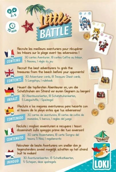 A vous le trésor ! L’or enfoui vous attend, caché sur la plage. Constituez le meilleur équipage et déterrez les coffres pour gagner le plus de pièces d’or. Et si d’autres pirates se mettent sur votre chemin, montrez-leur qui est le plus fûté ! Little Battle est un jeu de cartes très original sur fond de batailles et de collecte de trésors.