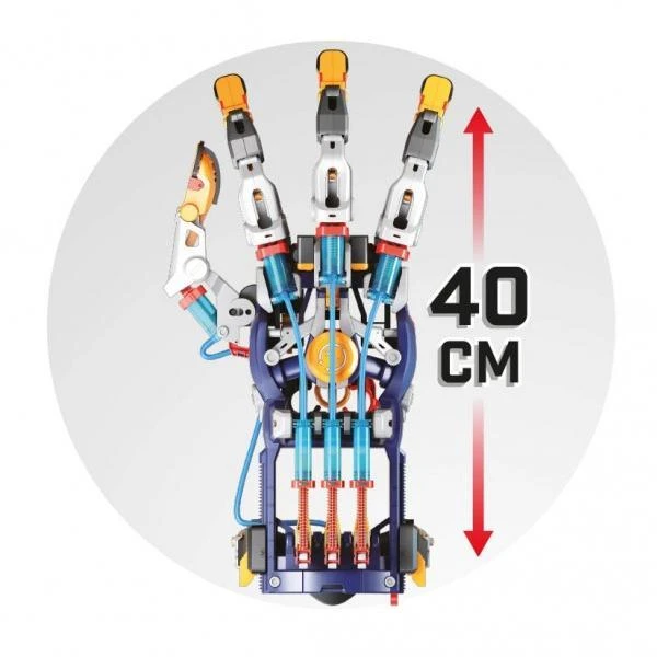 Construis une main cyborg articulée en assemblant les pièces. Ajoute de l’eau dans le système et pilote-la du bout des doigts.