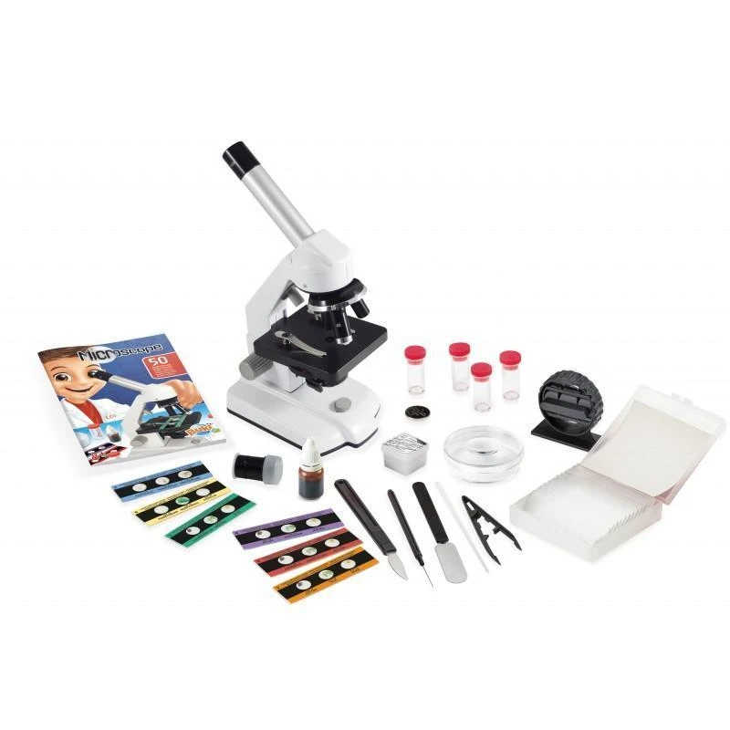 Accessoires inclus : 2 oculaires 10x et 25x, 6 lames d’échantillons, 12 lames vides, 1 boîte de Petri, 1 micro-trancheuse, 1 aiguille, 1 scalpel, 1 pince, 1 spatule, 1 agitateur, 4 petits flacons, 12 lamelles et 12 étiquettes, 1 loupe, Colorant rouge, 1 notice illustrée en couleurs.