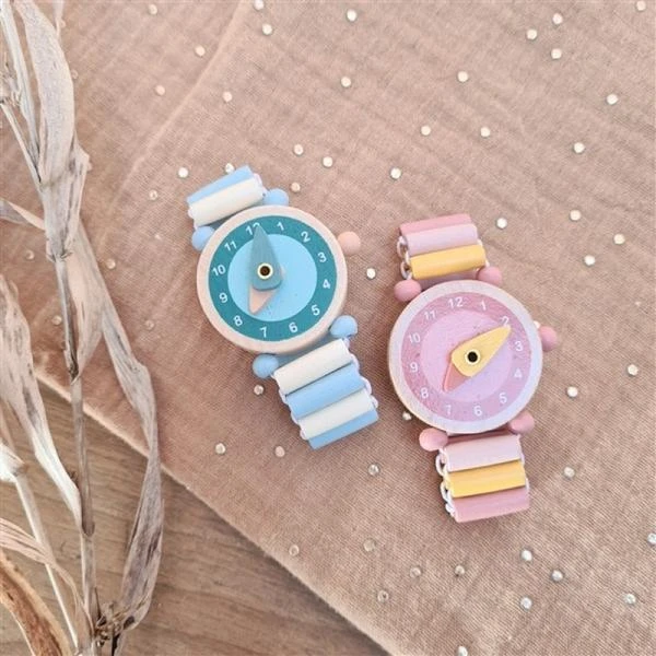 Voici une jolie montre en bois rose/orange avec aiguilles amovibles pour apprendre à lire l’heure.
