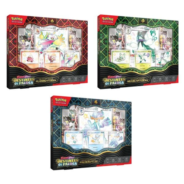 Obtenez l’évolution finale des Starters de Paldea en tant que Pokémon-ex chromatique, accompagné du Pokémon de base et de Niveau 1 en cartes promo. Vous pourrez mettre en valeur toute la chaîne évolutive dans un protecteur pour trois cartes. Vous trouverez également une carte grand format du Pokémon-ex chromatique mis en vedette ainsi que de nombreux booster Écarlate et Violet – Destinées de Paldea pour élargir votre collection