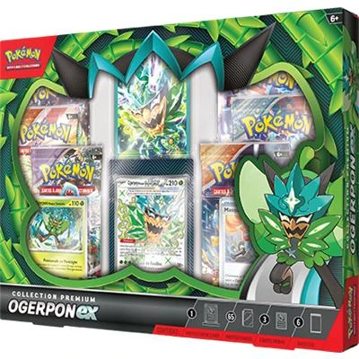 Vous découvrirez également une autre version d’Ogerpon Masque Turquoise et de la carte Dresseur Masque de Monstre en tant que cartes brillantes spéciales. Un protecteur de carte, un ensemble de protège-cartes et des boosters renforceront votre nouvelle amitié avec Ogerpon.