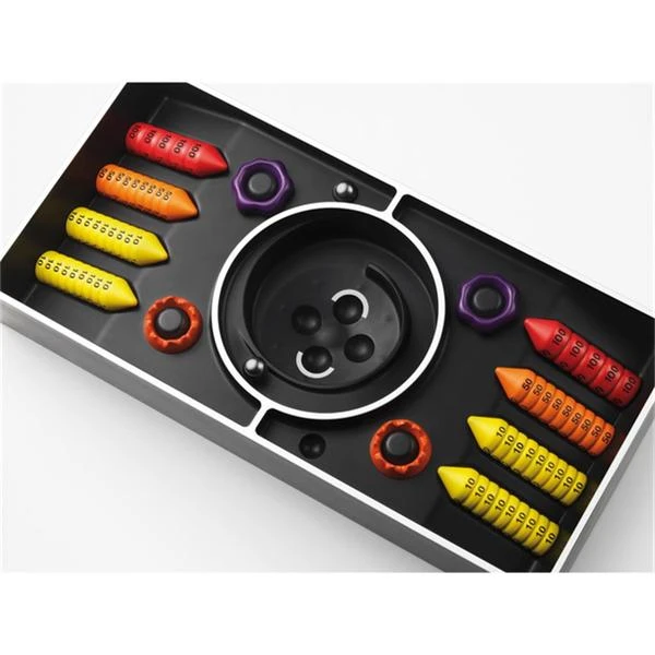 - Une boîte à outils pour ranger vos marqueurs de dégâts empilables, vos marqueurs de brûlure et d’empoisonnement et vos sphères en métal