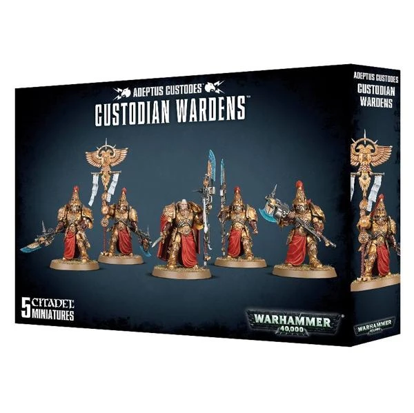 Ce kit plastique contient les composants nécessaires pour assembler une escouade de 5 Custodian Wardens. On les reconnaît aussitôt à leur robe de cérémonie et à leur armure d’auramite, qui leur donne un air splendide – comme toujours chez l’Adeptus Custodes, couverte de symboles de l’Empereur sculptés, avec des aigles impériaux, des éclairs, des gemmes et des filigranes à profusion. Chacun d’eux peut être armé au choix d’une lance de gardien ou d’une hache de castellan, le kit en comprenant 5 de chaque. Les heaumes, plumets et jambières du kit sont interchangeables, afin de configurer vos Wardens à votre guise.