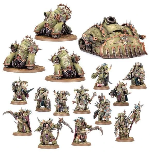 Si vous cherchez une force qui avance inexorablement à la bataille, et contre laquelle les assauts les plus féroces se briseront, la Bande Pestifère est la boîte faite pour vous. En plus d’un solide noyau d’infanterie de Marines de la Peste et de Terminators du Linceul, vous aurez la puissance de feu d’un Chenillé Crachepeste et d’un trio de Semi-chenillés Méphitiques.