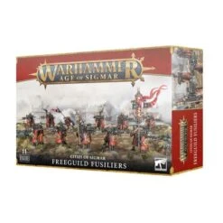 Ce kit plastique permet d’assembler 10 Fusiliers des Guildes Franches, accompagnés d’un Écuyer-balistite. Chaque Fusilier porte un lourd pavois sur lequel il monte son canon-fusil muni d’une baïonnette. On peut monter une des figurines en tant que Sergent Fusilier, armé d’une paire de pistolets ou d’un fusil moissonneur tritube, et une autre en tant que Héraut Fusilier, avec étendard et torche avec icônes et flammes au choix. L’Écuyer-balistite se hâte le long de la ligne pour fournir poudre et balles aux tireurs.