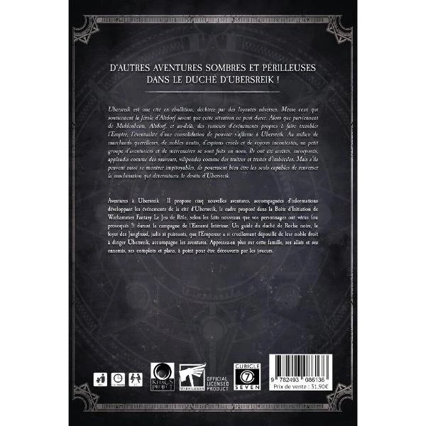 Aventures à Ubersreik II propose cinq nouvelles aventures, accompagnées d’informations développant les événements de la cité d’Ubersreik, le cadre proposé dans la Boîte d’Initiation de Warhammer Fantasy Le Jeu de Rôle, selon les faits nouveaux que vos personnages ont vécus (ou provoqués !) durant la campagne de l’Ennemi Intérieur.